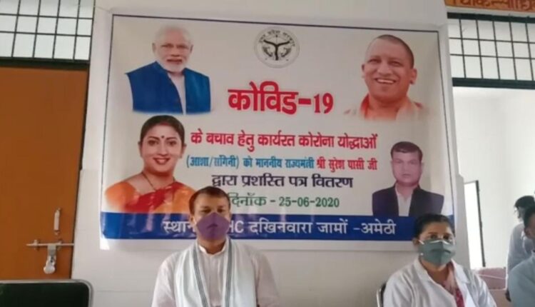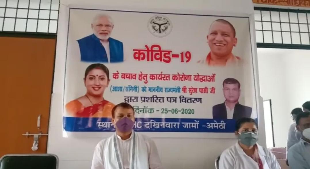 जगदीशपुर विधानसभा क्षेत्र से विधायक वा योगी सरकार में राज्यमंत्री सुरेश पासी ने जामो स्थित प्राथमिक स्वास्थ्य केंद्र दखिनवारा में कोरोना जैसी महामारी के बीच कोरोना वारियर्स के रूप में काम कर रही आशा बहू और संगिनी को कोरोना योद्धा प्रशस्ति पत्र देकर सम्मानित किया।