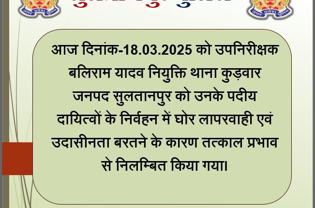 सुल्तानपुर न्यूज़ :- उप निरीक्षक बलिराम यादव को एसपी ने किया निलंबित।