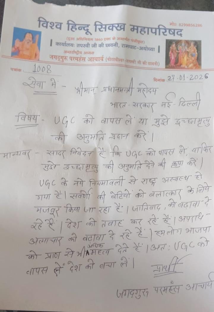 UGC कानून को लेकर संत परमहंस दास का PM मोदी को पत्र, इच्छामृत्यु की मांग