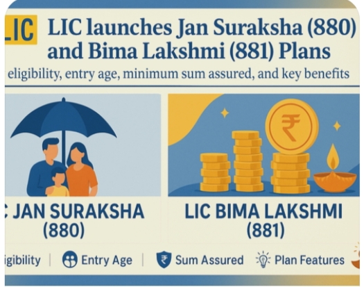Life Insurance Corporation of India (LIC) ने दो नए प्लान लॉन्च किए हैं — “Jan Suraksha Plan (880)” और “Bima Lakshmi Plan (881)”. Jan Suraksha मुख्यतः निम्न-आय समूह के लिए है, जबकि Bima Lakshmi महिलाओं के लिए विशेष रूप से डिज़ाइन किया गया है।