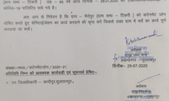 @सुलतानपुर-ग्राम-भैरोपुर(ग्राम-टिकारी) को कंटेनमेंट जोन घोषित करने के लिए लिखा पत्र