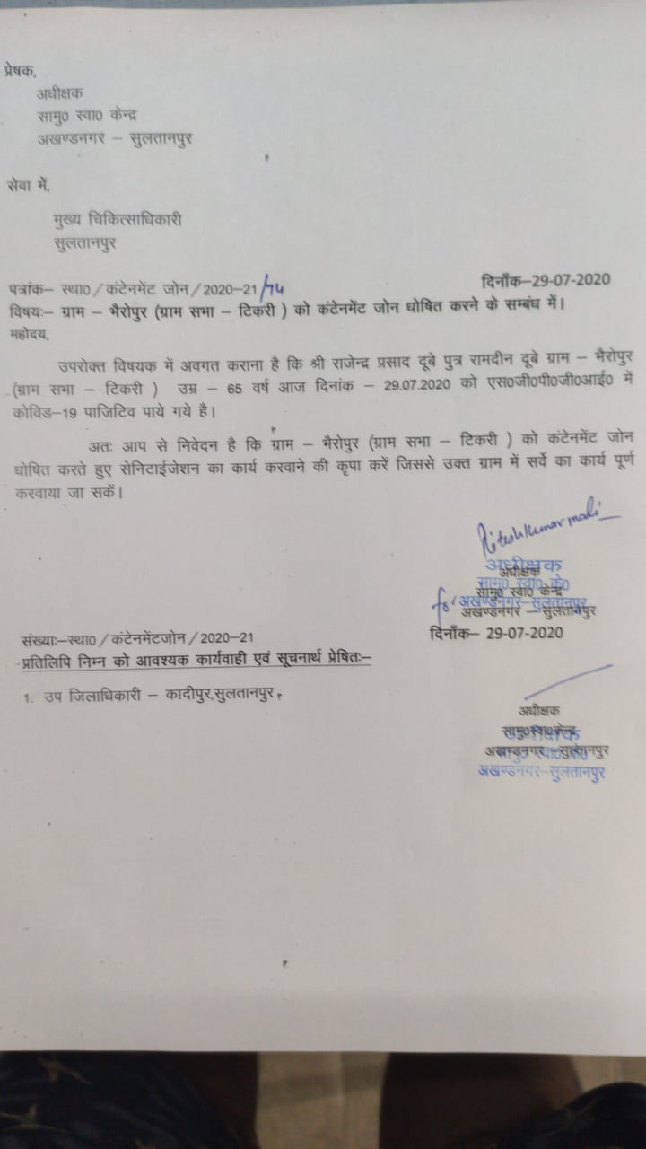 अखण्ड नगर विकास खण्ड के अधीक्षक सामु0 स्वा0 केंद्र अखण्ड नगर ने मुख्य चिकित्साधिकारी सुलतानपुर को अपने पत्र में अवगत कराया है कि राजेंद्र प्रसाद दूबे पुत्र रामदीन दूबे ग्राम- भैरोपुर(ग्राम सभा-टिकरी) उम्र-65 वर्ष आज दिनांक 29-07-2020 को एस0जी0पी0जी0आई0 में कोविड-19 पॉजिटिव पाए गए हैं। जिसको देखते हुए ग्राम- भैरोपुर(ग्राम सभा- टिकरी) को कंटेनमेंट जोन घोषित कर सेनिटाईजेशन का कार्य करवाने का आदेश दें जिससे ग्राम में सर्वे का कार्य पूर्ण हो सके और क्षेत्र की जनता को कोविड-19 वैश्विक महामारी से बचाया जा सके।