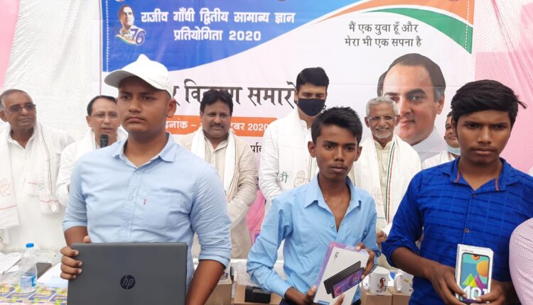 प्रथम स्थान पाने वाले प्रतिभागी को लैपटॉप द्वितीय प्रतिभागी को मोबाइल व अन्य प्रतिभागी को को बैग व अन्य चीजें वितरित की गई।इस दौरान कांग्रेस के कई नेताओं ने इस प्रतियोगिता में बढ़ चढ़कर हिस्सा लिया और सफलता पूर्वक इस आयोजन का समापन किया राजीव गांधी को याद करते हुए कांग्रेसी नेताओं ने कहा कि जिले में राजीव गांधी के नाम से ऐसी योजनाएं चलाई जाती रहेंगी जिसका मकसद होगा कि हम गांव के हर नौजवान तक पहुंच कर उन्हें आगे लाने का प्रयास करें उन्हें उनकी प्रतिभा को निखारने का प्रयास करें।