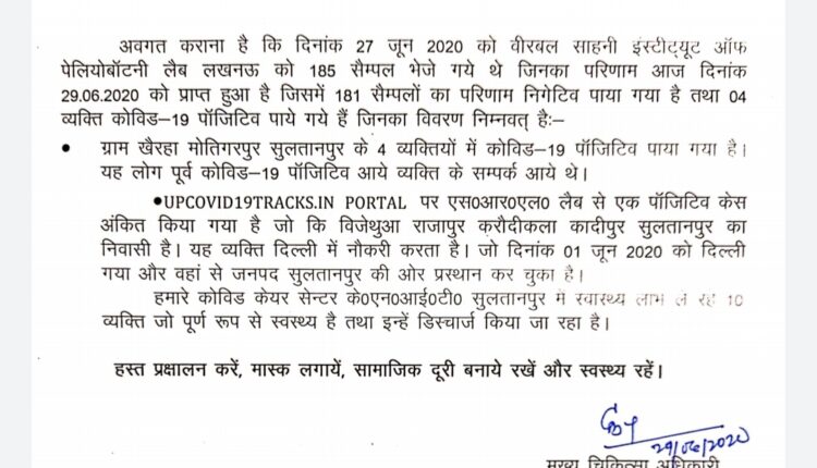 सुल्तानपुर-जिले में 6 नये मिले कोरोना मरीज। कुल पॉजिटिव मरीजों के संख्या पहुंची 190। 36 एक्टिव मरीजों का चल रहा इलाज। 5 लोगों की हो चुकी है मौत। मुख्य चिकित्साधिकारी ने की पुष्टि
