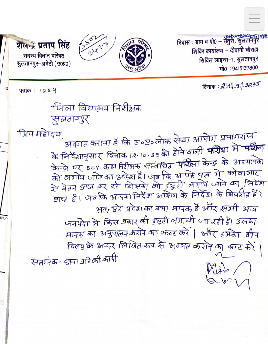 जिला विद्यालय निरीक्षक की मनमानी पर एमएलसी शैलेंद्र प्रताप सिंह ने लिखा पत्र।