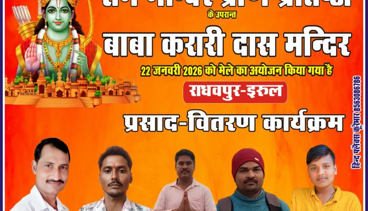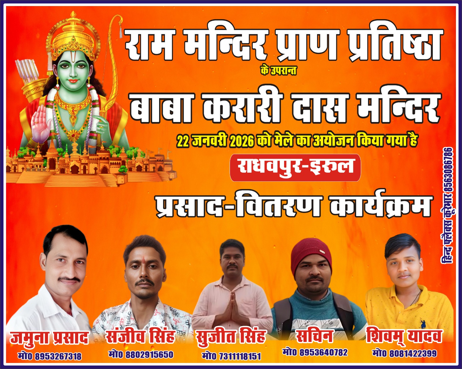 अयोध्या में भगवान श्रीराम मंदिर की प्राण प्रतिष्ठा की प्रथम वर्षगांठ के पावन अवसर पर जनपद सुलतानपुर के राघवपुर-इरुल स्थित बाबा करारी दास मंदिर परिसर में 22 जनवरी 2026 को भव्य प्रसाद वितरण एवं धार्मिक आयोजन का आयोजन किया जाएगा।
