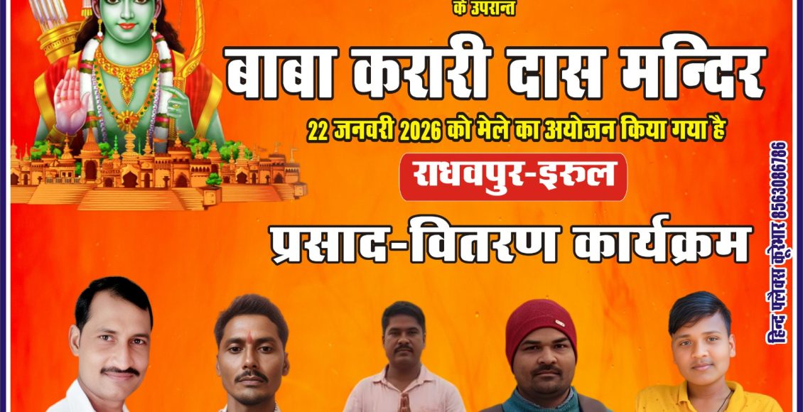 📰 खबर राम मंदिर प्राण प्रतिष्ठा के उपलक्ष्य में बाबा करारी दास मंदिर पर होगा भव्य प्रसाद वितरण कार्यक्रम। सुलतानपुर।अयोध्या में भगवान श्रीराम मंदिर की प्राण प्रतिष्ठा की प्रथम वर्षगांठ के पावन अवसर पर जनपद सुलतानपुर के राघवपुर-इरुल स्थित बाबा करारी दास मंदिर परिसर में 22 जनवरी 2026 को भव्य प्रसाद वितरण एवं धार्मिक आयोजन … Continue reading राम मंदिर प्राण प्रतिष्ठा अवसर पर बाबा करारी दास मंदिर में प्रसाद वितरण | सुलतानपुर