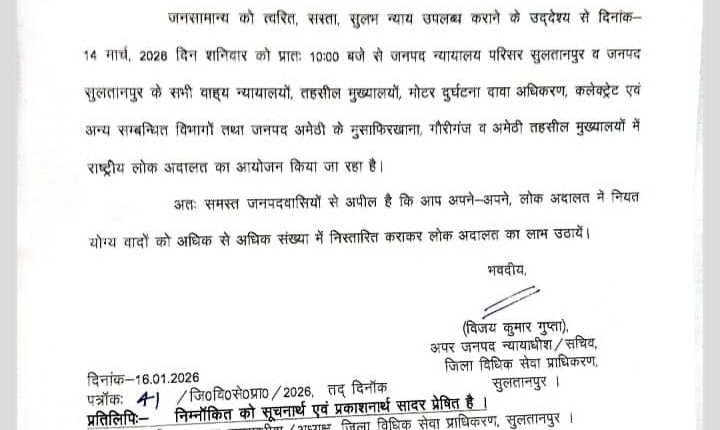 जनसामान्य को त्वरित, सस्ता और सुलभ न्याय उपलब्ध कराने के उद्देश्य से आगामी 14 मार्च 2026 (शनिवार) को जनपद में राष्ट्रीय लोक अदालत का आयोजन किया जाएगा। यह जानकारी अपर जनपद न्यायाधीश एवं सचिव, जिला विधिक सेवा प्राधिकरण सुल्तानपुर विजय कुमार गुप्ता ने दी।