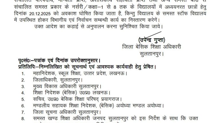कड़ाके की ठंड से राहत: सुलतानपुर में कक्षा 1 से 8 तक के स्कूल 20 दिसंबर को बंद।