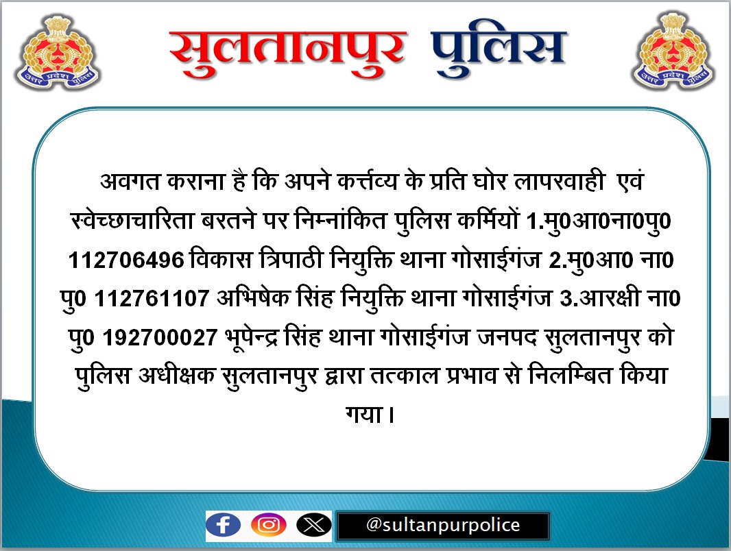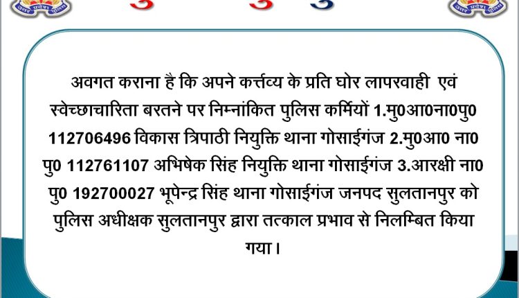 कर्तव्य के प्रति घोर लापरवाही और स्वेच्छाचारिता बरतने के आरोप में पुलिस अधीक्षक सुल्तानपुर ने थाना गोसाईगंज में तैनात तीन पुलिसकर्मियों को तत्काल प्रभाव से निलंबित कर दिया है।